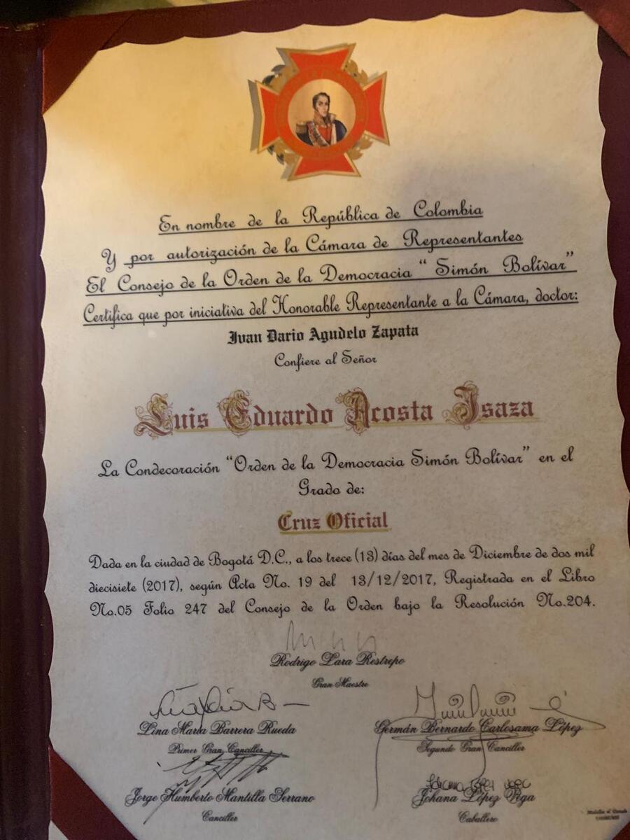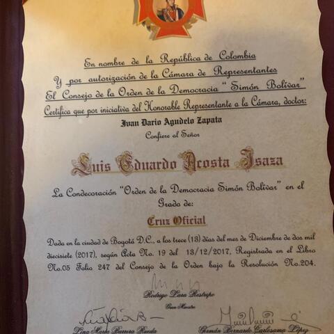 Congreso de Colombia: Orden de la Democracia Simón Bolívar (Cruz Oficial).